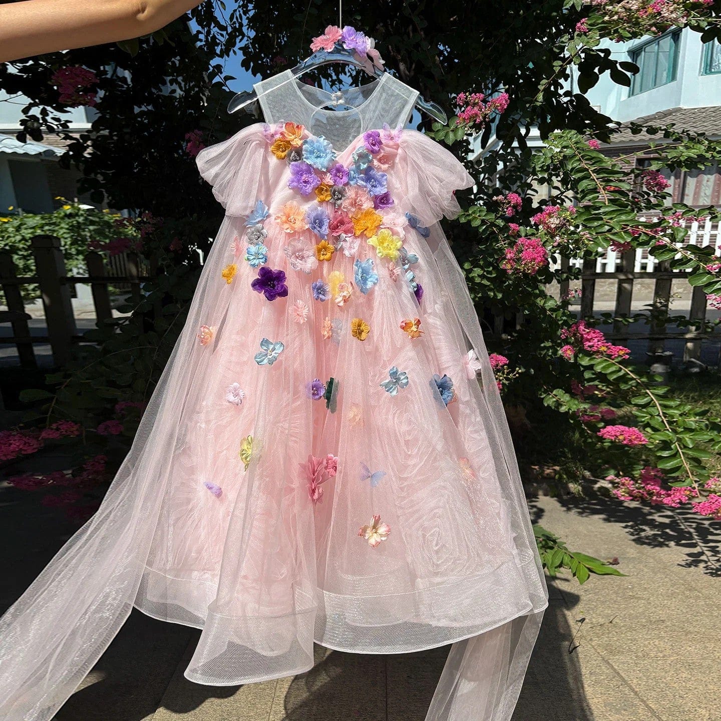 3m / Pink Sunnypetal Luxury Green Flower Girl Gown with 3D Floral Appliqués