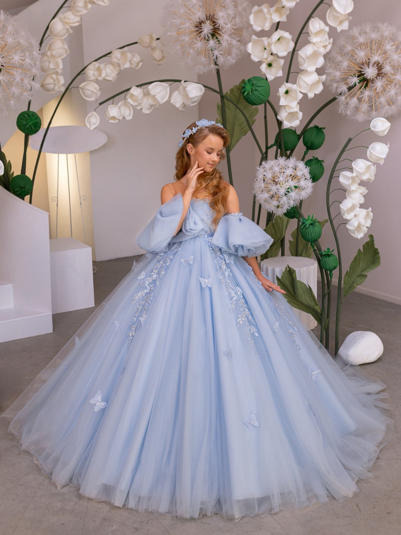Step into a world of enchantment with the Sunnypetal Light Blue Tulle Flower Girl Ball Gown. Crafted from layers of soft, flowing tulle, this princess-style dress features delicate butterfly and floral appliqués, sparkling sequins, and detachable puff sleeves for a whimsical, fairy-tale look. The scoop neckline and lace-up back ensure a perfect fit, while the court train adds a touch of elegance with every step. Fully lined for comfort, this gown transforms every little girl into the center of attention, making her feel truly magical on the most special occasions.