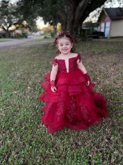6m / Customized Sunnypetal Burgundy Tulle Lace Appliques Beading Ball Gown Flower Girl Dresses